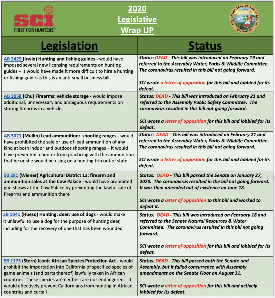 The California legislature adjourned on August 31, 2020, the last day of the 2019-2020 Legislative Session. During a legislative session defined and shaped by COVID-19, Safari Club International and its members in California were able to track 127 bills that would impact sportsmen and women and officially took positions on 43 bills.