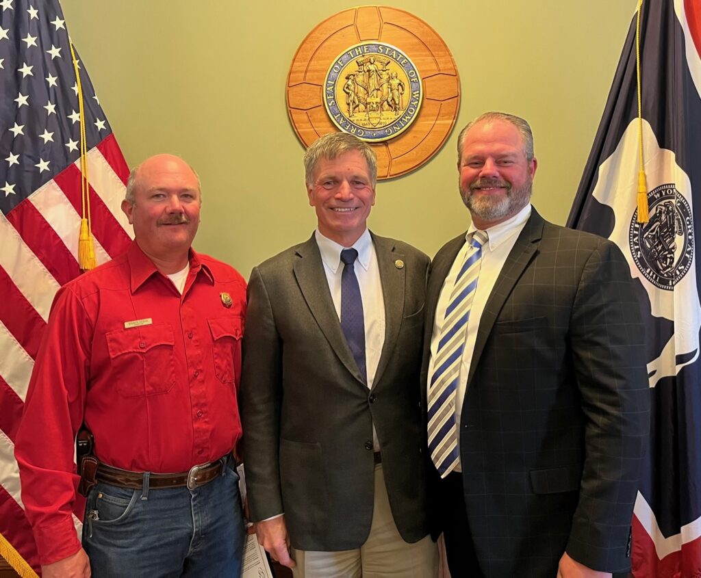Wyoming: SCI Western State and Local Liaison Chris Tymeson travelled to Wyoming during the week of September 18th to celebrate National Hunting and Fishing Day and attend the Wyoming Governor’s Proclamation Signing Ceremony for National Hunting and Fishing Day. While there, Tymeson also met with Department of Game and Fish officials regarding the business of SCI. Pictured L-R below: Wyoming Game and Fish Director Brian Nesvik, Wyoming Governor Mark Gordon, and SCI Western State and Local Liaison Chris Tymeson.