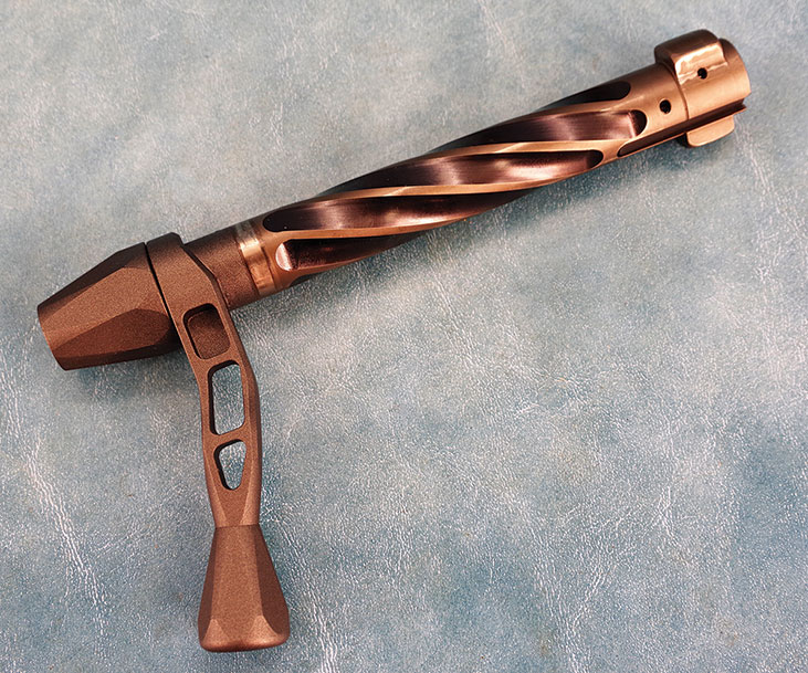 The bolt itself is distinctive only in that it is deeply spiral fluted, which reduces friction and the tendency to bind. Even when bone dry the bolt travel was very smooth, and with a little lubricant it was silky. The handle itself is skeletonized to save weight, and it looks cool. Lock-up is achieved via two massive lugs at the head of the recessed bolt face from which not one, but two plunger ejectors protrude. Such redundancy literally guarantees foolproof ejection. Extraction is courtesy of an M-16-type extractor.