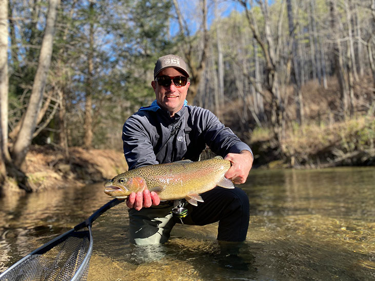 Russ had caught a nice ’bow a few minutes earlier. Our buddy John Burrell released what could have been a 10-pounder on his first cast. Yes, a double-digit-pound ’bow. And these are no wet-blanket pellet pigs. They survive the summer thanks to cool spring-fed mountain waters and the riverbank shade. They’re wild and angry.