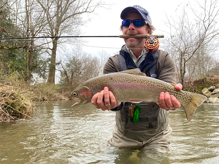 I tied on two nymphs, a bead-head pheasant-tail and then a bead-head Copper John. I used a tapered 9-foot, 5X leader, but went to a 12-foot, 6X as the water cleared and the bite slowed midday. I put a small split-shot near the first nymph and a strike indicator near the fly line. We also got fish on a parachute Adams with various nymphs on a dropper. A highly visible Y2K in orange and yellow, which mimics eggs dropped by spawning trout, also caught fish.