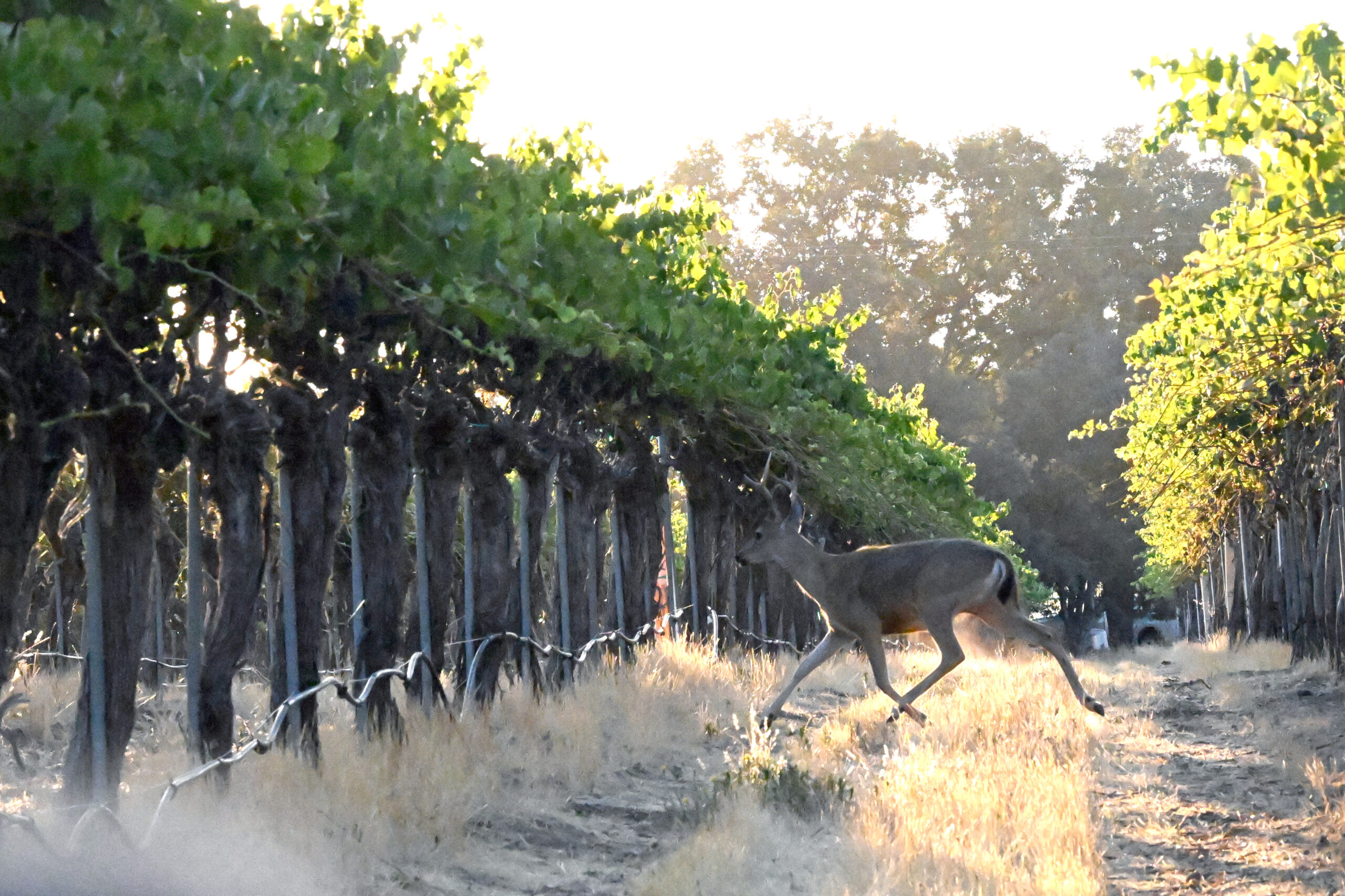 Glassing down onto the vineyard, it was easy to see up alleys and between vines growing on a trellis system. But you can only see one row at a time. It’s impossible to see anything a few rows over, a lot like looking down an early season corn row. Deer are exposed as they walk into your field of view, and they disappear as they slip through the lines of merlot, zinfandel or grenache.