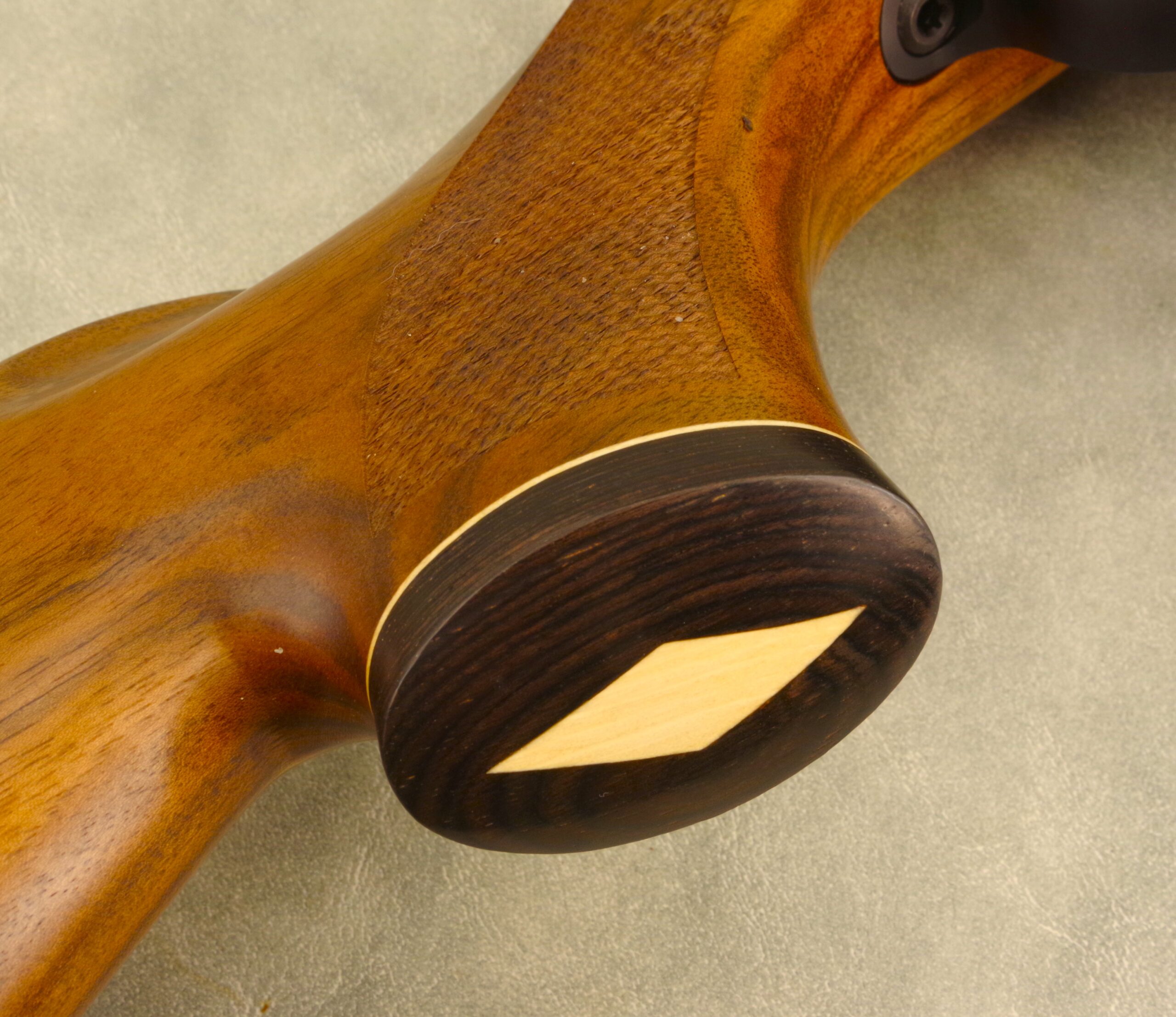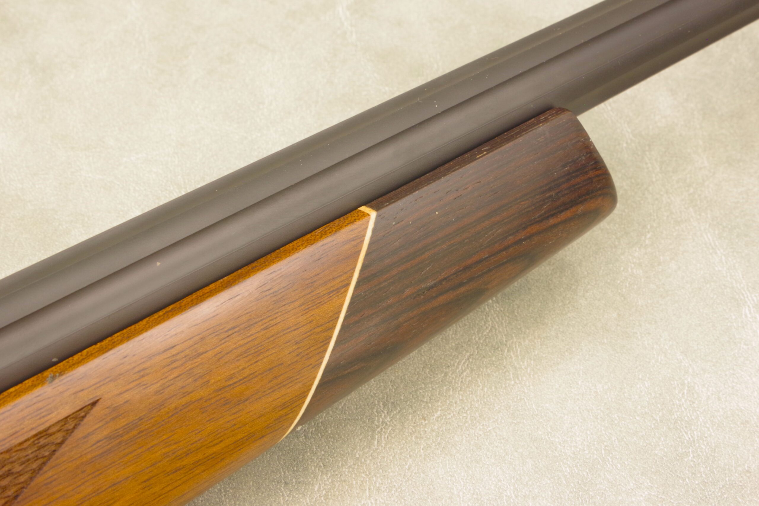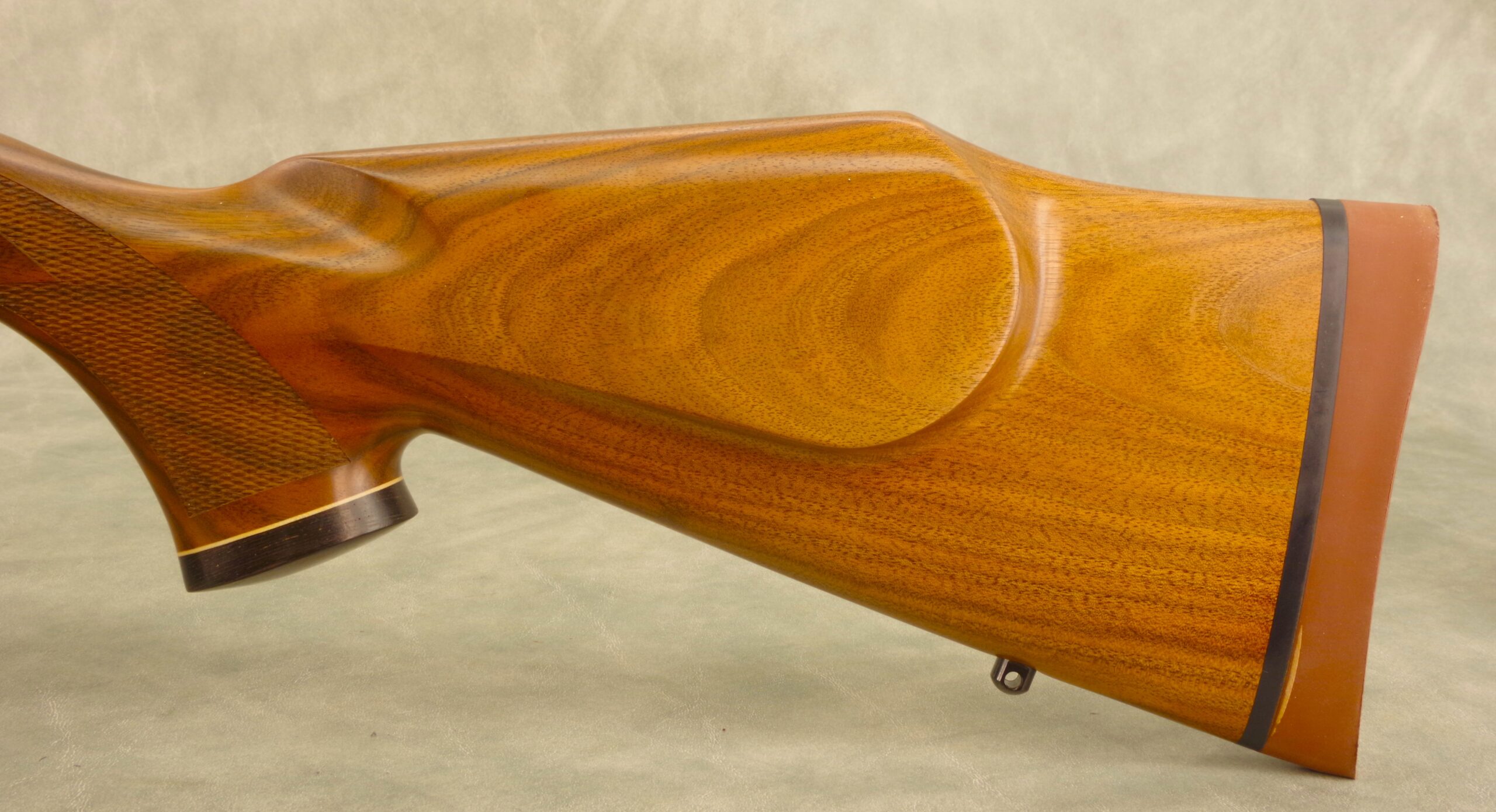 These three photos show three designs pulled from the original Weatherby style: Monte Carlo dip, pistol grip cap and angled rosewood fore-end..