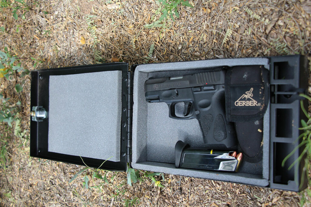 First, I placed a full-sized service type weapon (my selection was a .45 ACP Ruger) along with two additional magazines. The firearm and the magazines fit well within the box. It closed and locked perfectly. I then placed a compact 9mm and extra magazine with a spare cell phone in the lock box. Again, the box closed and locked with no issues.