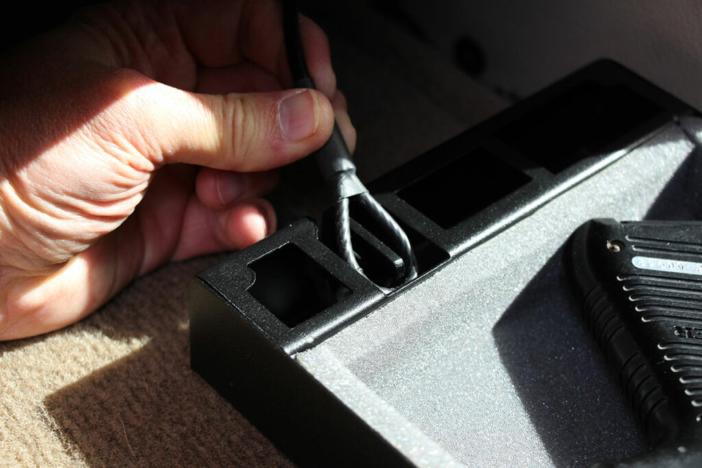 I then took the lockbox with the Ruger to my SUV to see how easy (or difficult) it would be to use the included security cable to attach to the seat mounts. The security cable fits easily into a built-in slot in the face of the lockbox.