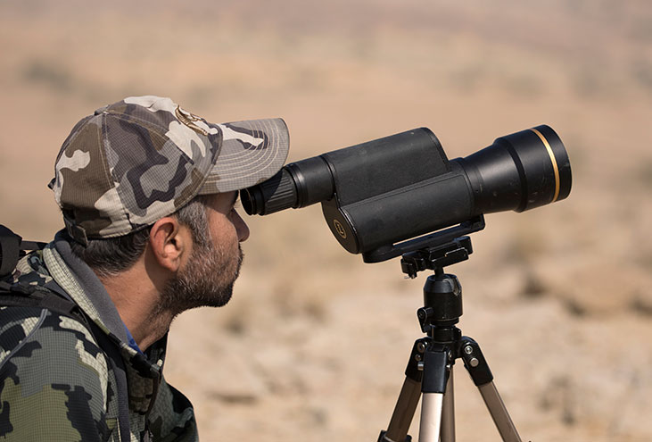 After an hour, one of the local guides suddenly spots an ibex under a large bush with dense branches. It is an ibex with very light fur, which means an old buck. Though it is possible for me to shoot in between the branches, I want to see the horns properly before the shot is fired.