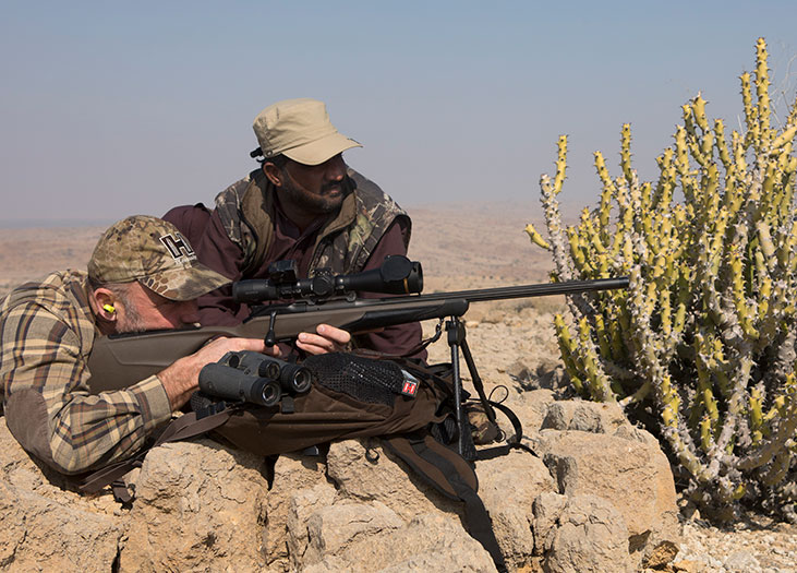 We stalk to a position at a distance of approximately 275 meters where we can wait for him to get up and get out into the open. For two hours we lie under the burning sun. Every time the ibex gets up, I throw myself into the shooting position and get ready. The sharp stones and rocks bite like rat teeth in both knees and elbows when I have to move into position fast, but when a chance arises it is important to be ready. The first three times the ibex gets up, he does not intend to leave the cover. The ibex just turns around to lie down on his other side. An hour before sunset, he gets up for the fourth time and this time stays on his feet. I am ready when the ibex leaves its hiding place, but it never gets completely clear before it settles down again, this time behind a completely dense succulent bush a few meters higher up the mountainside.