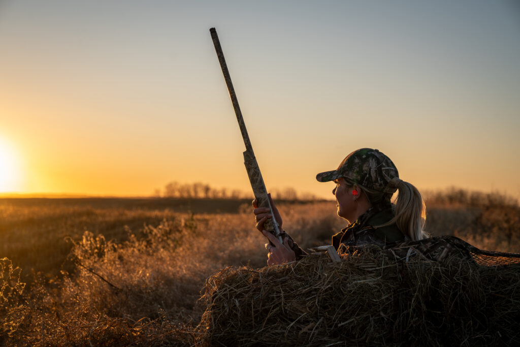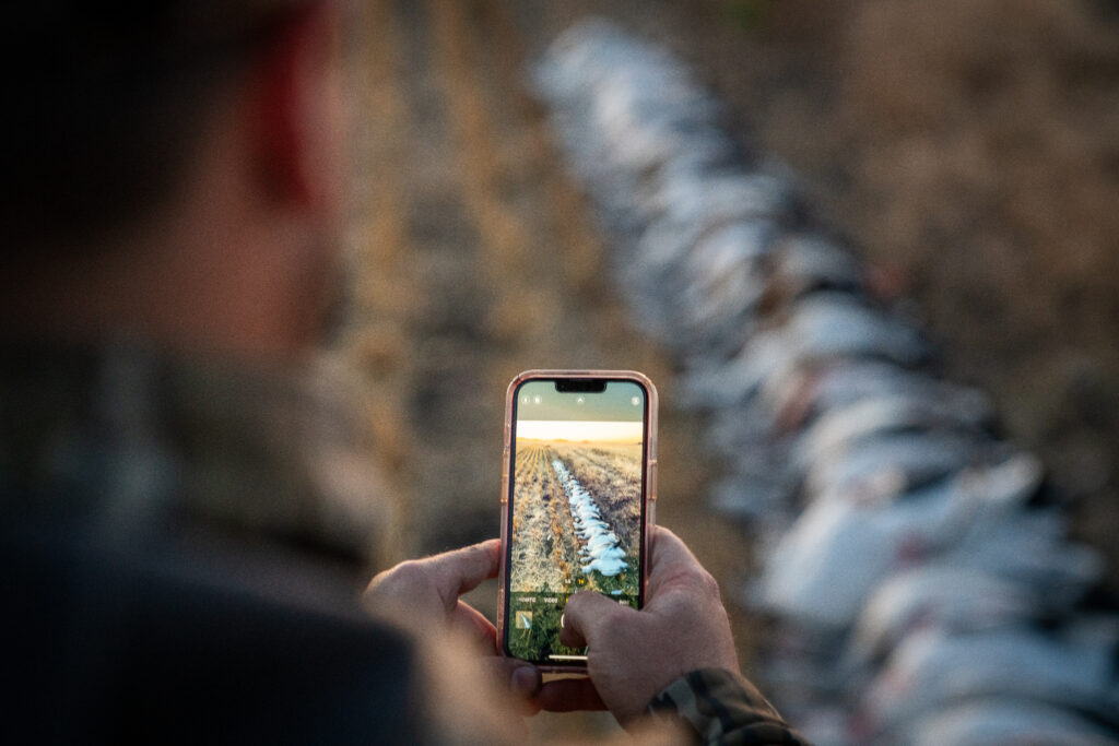That evening, we arrived to the field as the descending sun cast a golden glow over the sprawling expanse of harvested wheat. We set up an A-frame along a slough that extended towards a lake where we could hear the distant honking of geese and the faint calls of mallards. Under a sky painted with hues of soft red and purple, we unloaded armloads of goose decoys from two trailers and arranged them in a half-moon pattern composed of small family groups. At the same time, the other guides meticulously brushed the blind with cut branches and straw until it seamlessly blended into the draw.