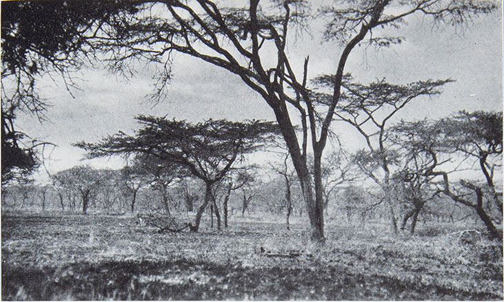 We reached and examined the rocky outcrop. Then quite idly we turned down the valley in which we stood. Along the center of the valley ran a shallow dry watercourse in the bottom of which grew various sorts of brush. This brush strip varied in width from nothing to 100 feet. Memba Sasa and I took one side of it, while Sanguiki and two carriers took the other. We had no idea of what to expect.