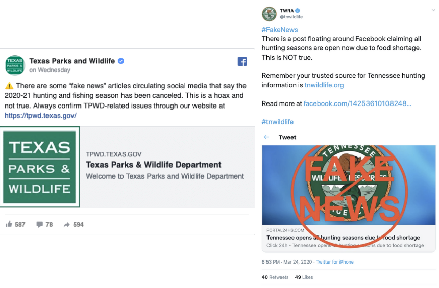 State Fish and Wildlife Agencies have also been affected by the current pandemic, and many agencies have made operational changes like canceling events and seminars, closing target shooting ranges, boat ramps, and other facilities, and prohibiting access in certain areas. However, there has been a tremendous amount of fake news and misinformation circulating online with claims that hunting and fishing seasons have been cancelled, or that harvest limits and seasons have been waived due to food shortages. These claims are, in most cases, unequivocally false but some of the rumors gained so much traction that state agencies were forced to respond.